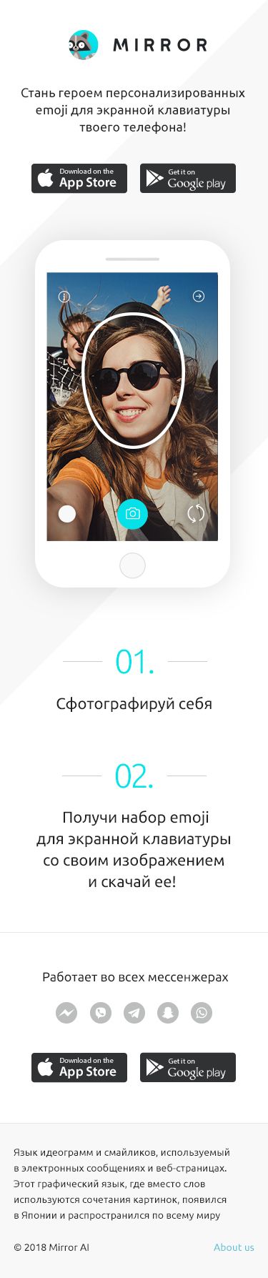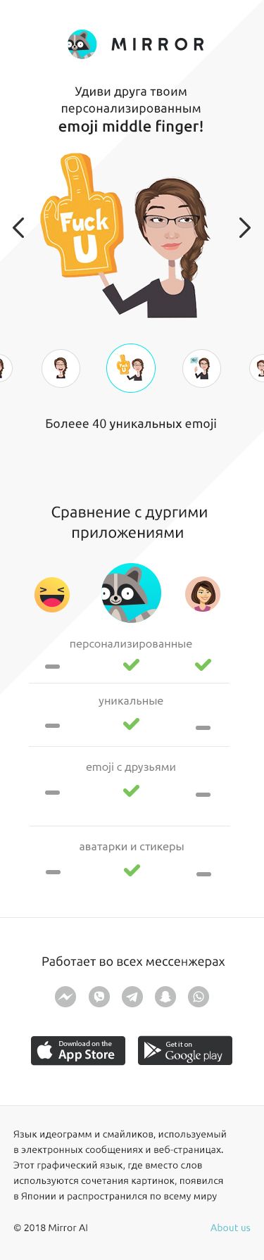 Mirror — это мобильное приложение, которое создает из селфи пользователя набор emoji во множестве различных эмоций. Также, приложение может создать совместные селфи с друзьями пользователя приложения. Разработал серию мобильных посадочных страниц с простым и удобным интерфейсом управления контентом под капотом.