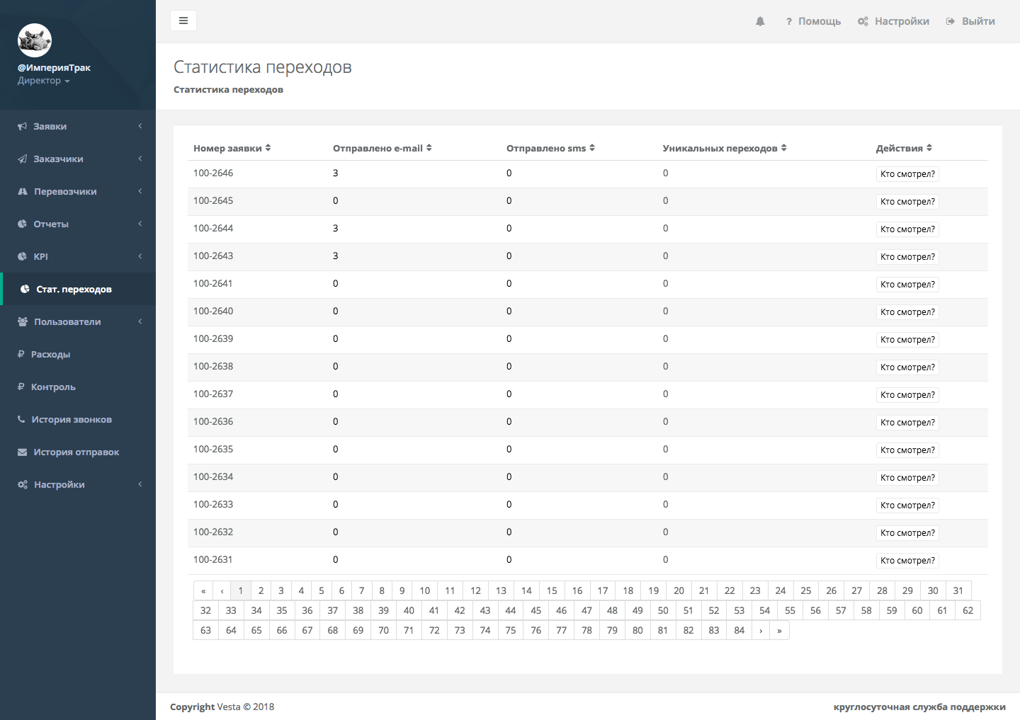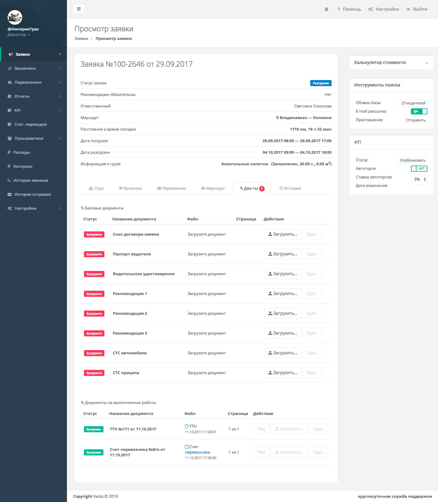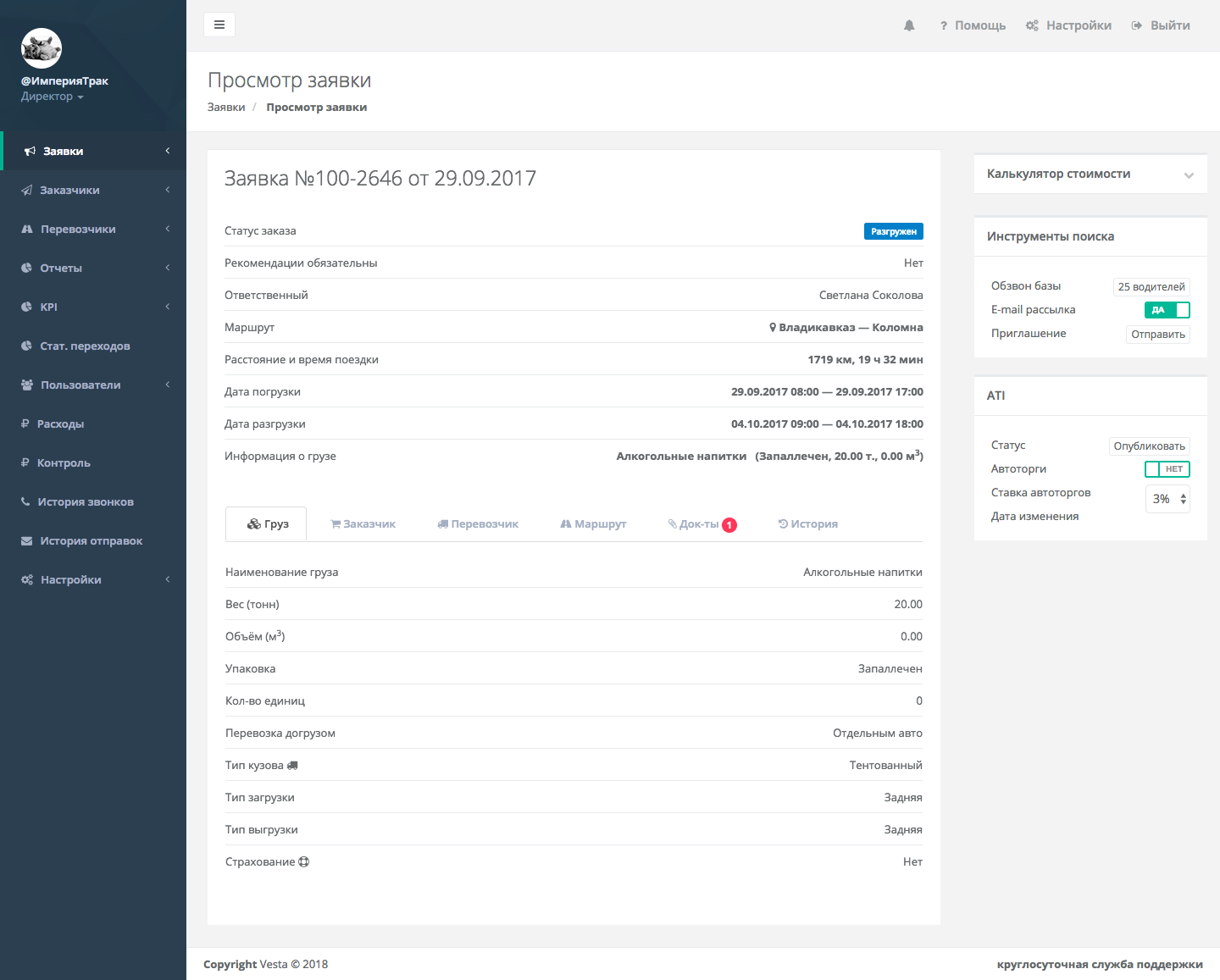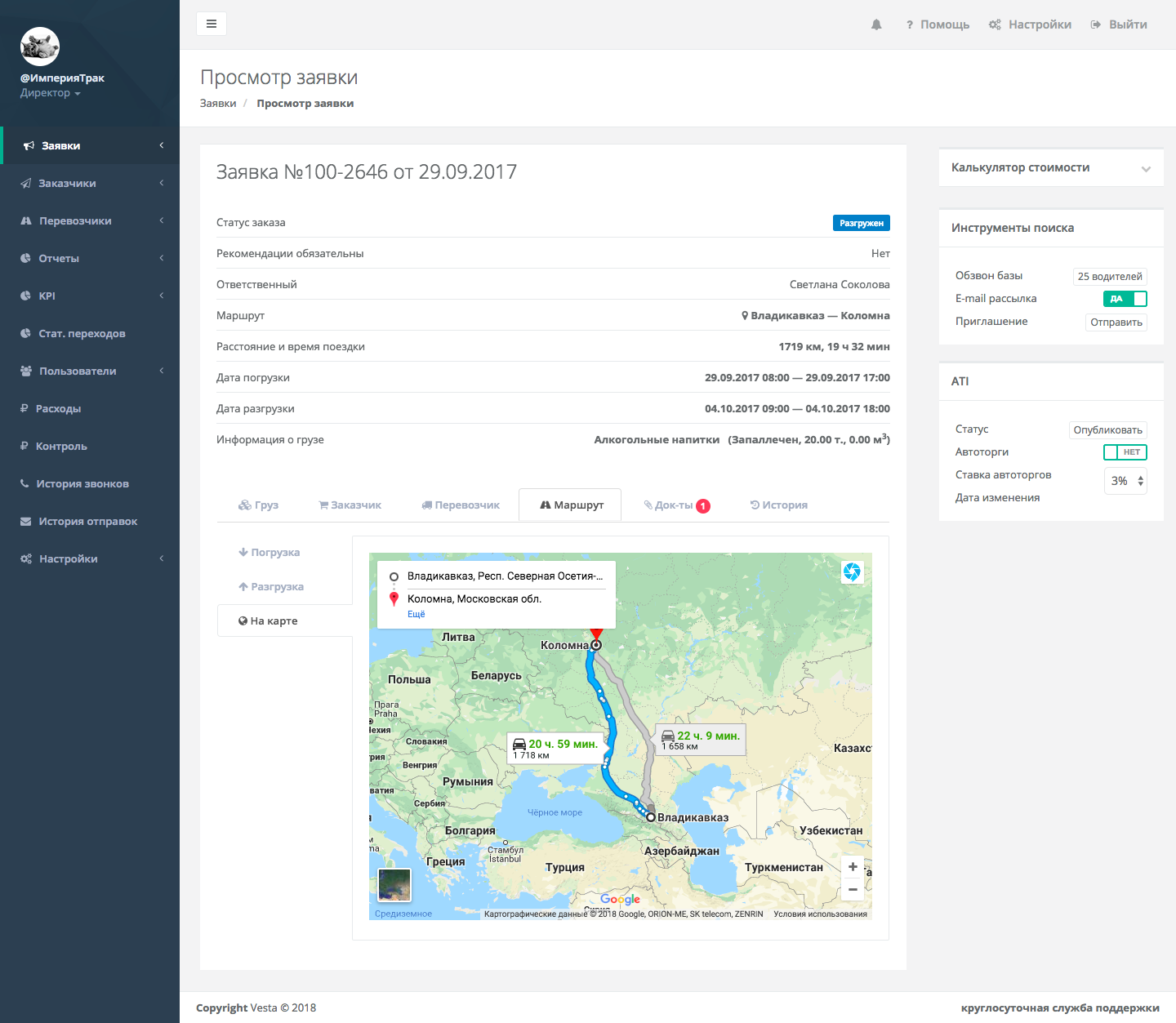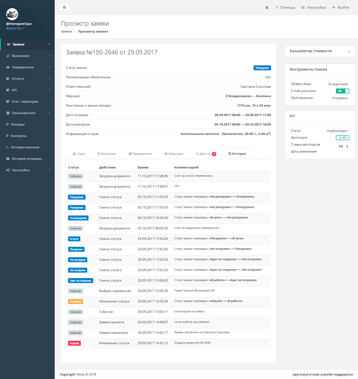 Платформа «VESTA» автоматизировала работу компаний, занимающихся грузовыми перевозками в России. Сервис отслеживает весь процесс грузовых перевозок от заявки до разгрузки.